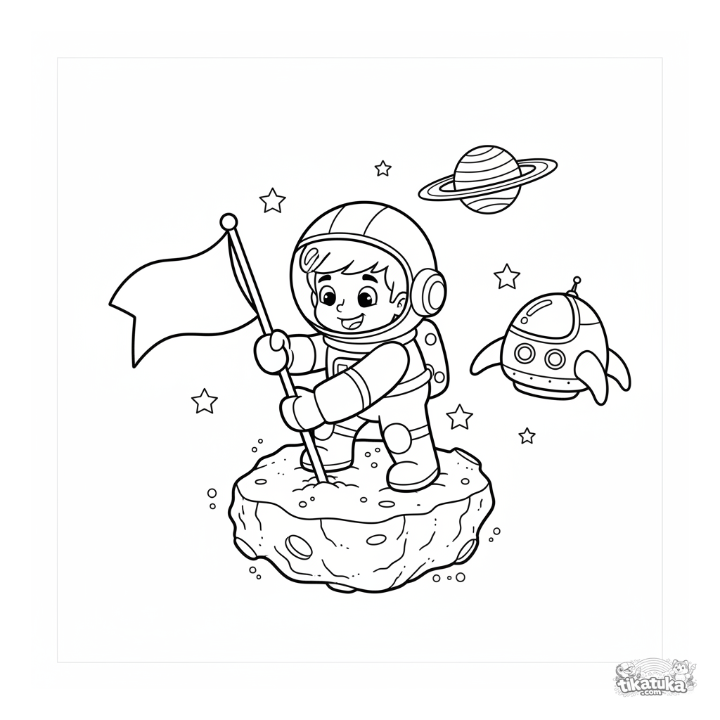 Ausmalbild eines Astronauten im Weltraum. Für Kinder von 5-8 Jahren. Der Astronaut im Anzug pflanzt eine Flagge auf einem Asteroiden, ein Raumschiff ist in der Nähe.