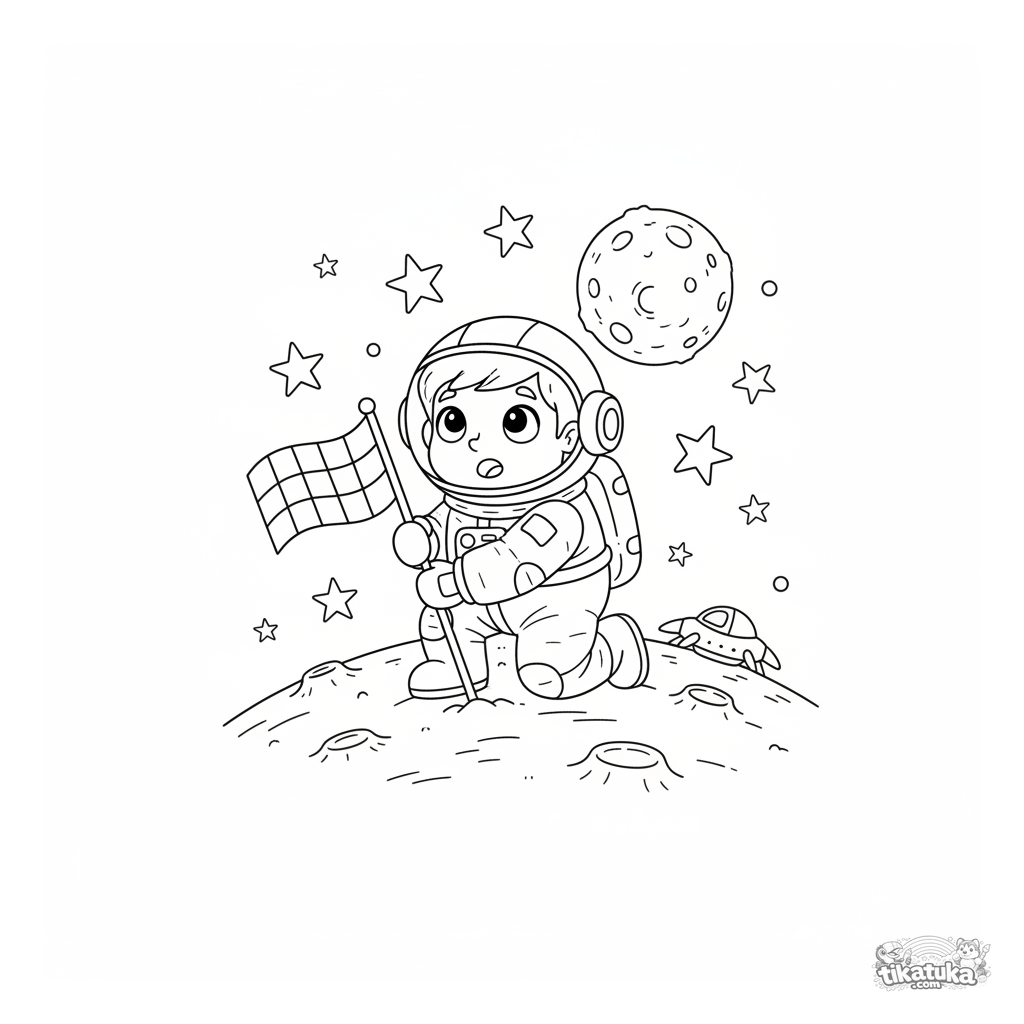 Ein Weltraum-Ausmalbild mit einem Astronauten, der eine Flagge auf einem Ringplaneten pflanzt. Einfache kosmische Szene für Kinder von 4-6 Jahren.