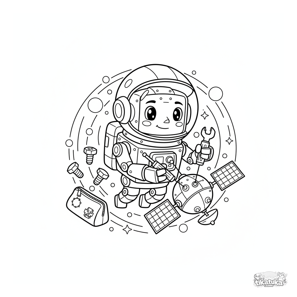 Ausmalbild eines freundlichen Astronauten-Roboters, der einen Satelliten im Weltraum repariert. Für Kinder von 5-8 Jahren.