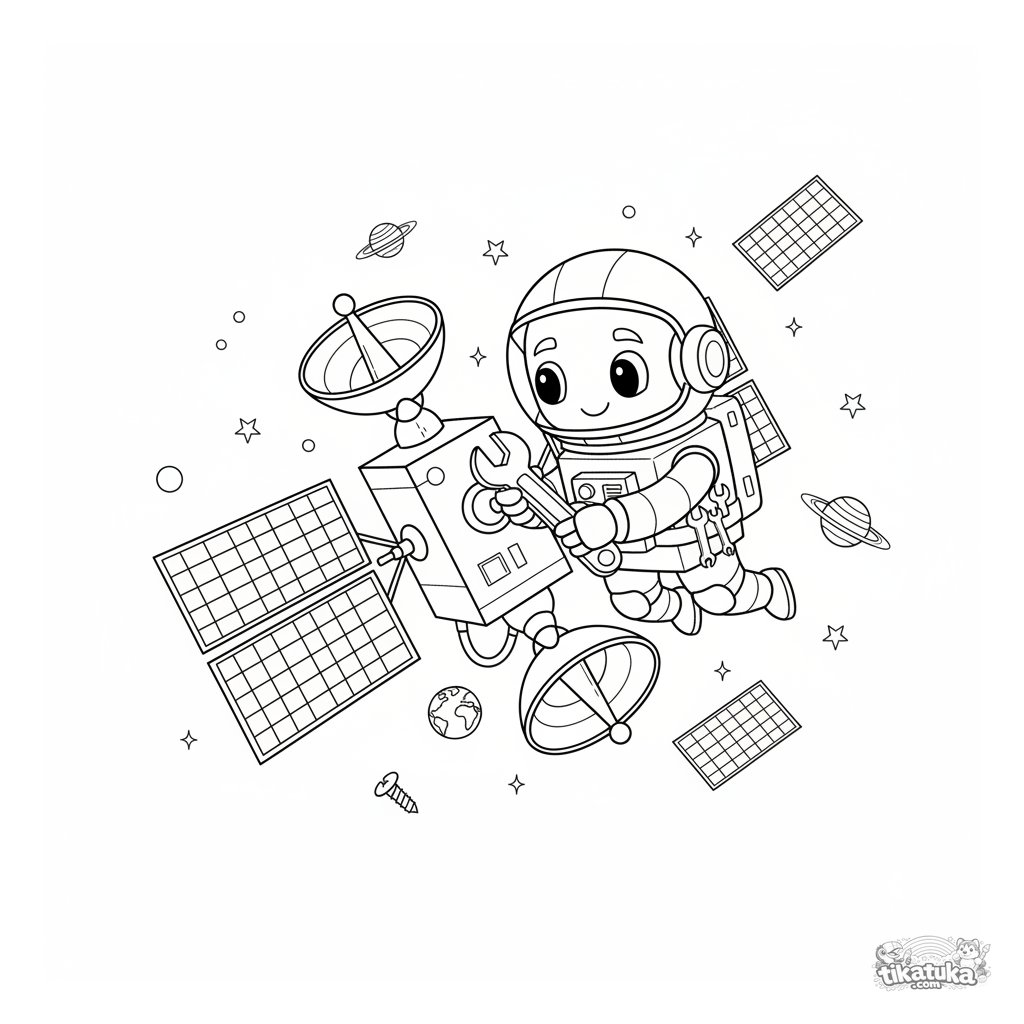 Weltraum-Ausmalbild: ein freundlicher Astronauten-Roboter repariert einen Satelliten vor sternenübersätem Hintergrund. Für Kinder von 6-9 Jahren. Hoher Detaillierungsgrad mit Werkzeugen, Satellitenpanelen und Planeten.