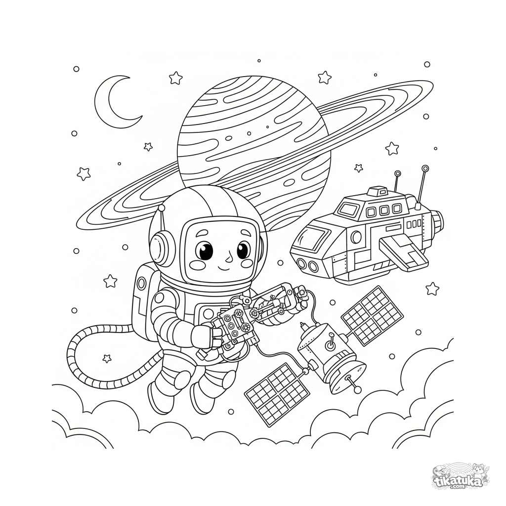 Ausmalbild 6-9: Ein süßer Roboter im Raumanzug repariert einen Satelliten, der einen Ringplaneten umkreist. Weltraumszene mit Werkzeugen und Leine.