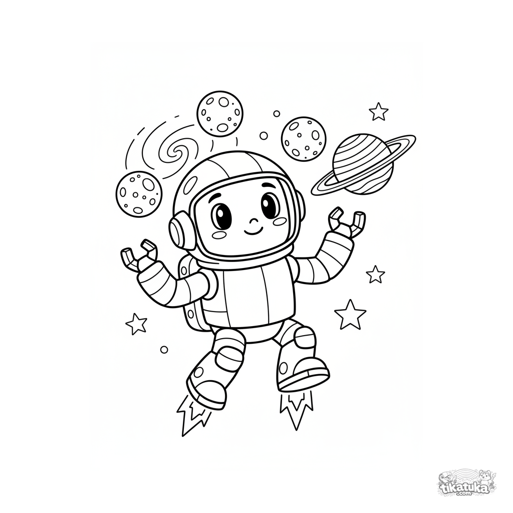 Ausmalbild eines freundlichen Astronauten-Roboters, der mit kleinen Monden im Weltraum in der Nähe eines Ringplaneten jongliert. Für Kinder von 5-8 Jahren. Eine lustige Weltraumszene auf weißem Hintergrund.