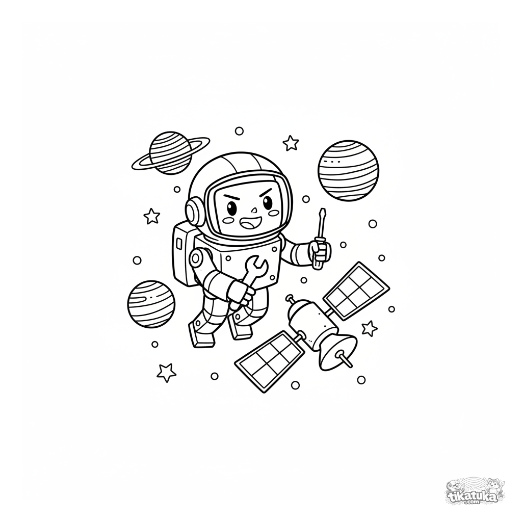 Ausmalbild eines Astronauten-Roboters, der einen Satelliten im Weltraum repariert. Für Kinder von 5 bis 8 Jahren.
