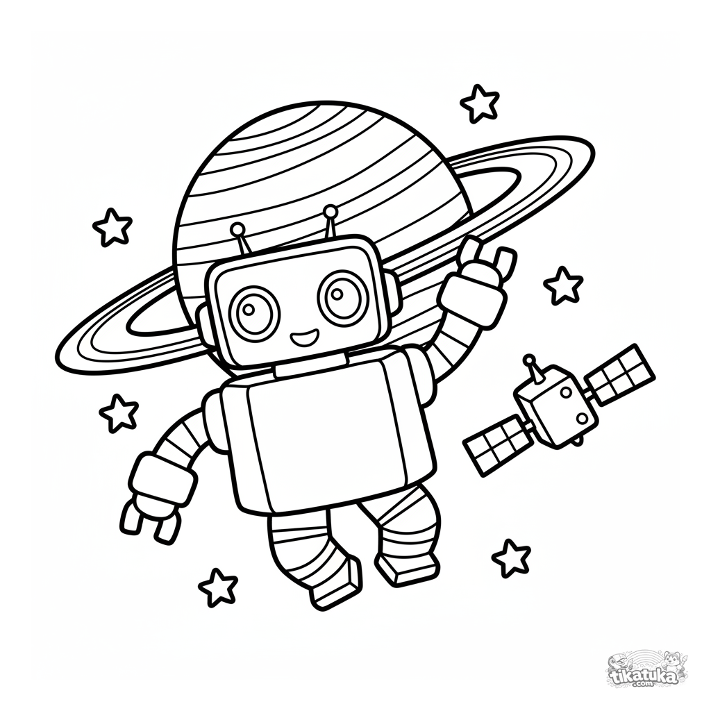 Einfaches Weltraum-Ausmalbild für Kleinkinder: Ein freundlicher Astronauten-Roboter schwebt near einem Ringplaneten. Für Kinder von 2-5 Jahren. Große, einfache Formen, sehr breite Ränder.