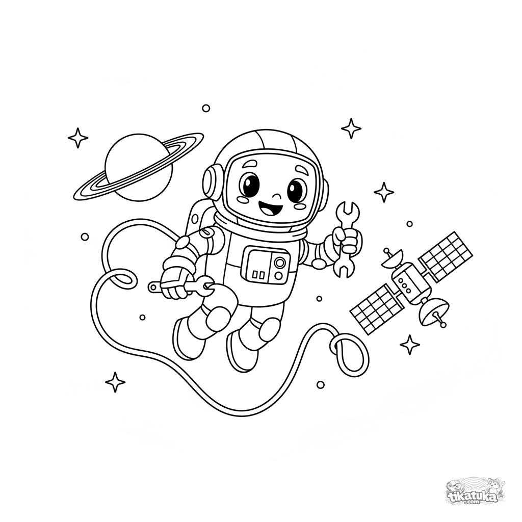 Weltraum-Ausmalbild: ein freundlicher Astronauten-Roboter schwebt neben einem Satelliten. Für Kinder von 5-8 Jahren.