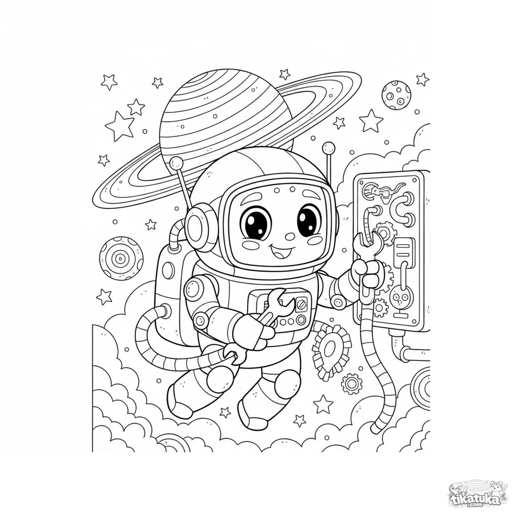 Ausmalbild eines freundlichen Astronauten-Roboters, der im Weltraum bei einem Ringplanet Reparaturen durchführt. Für ältere Kinder von 7 bis 12 Jahren.