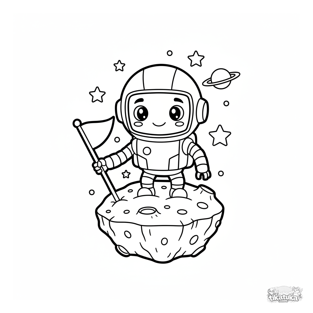 Ausmalbild eines süßen Astronauten-Roboters, der eine Flagge auf einem Asteroiden pflanzt. Für Kleinkinder von 2-5 Jahren.