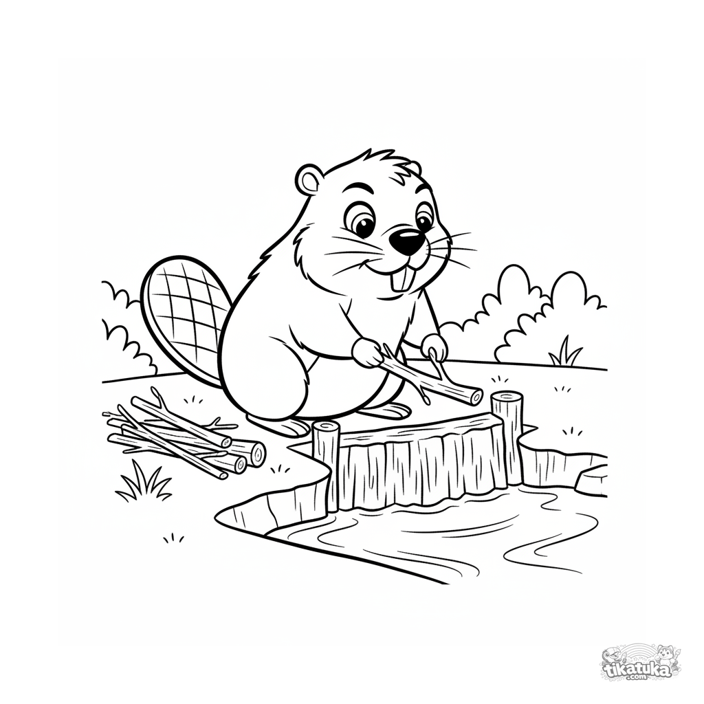 Ausmalbild für Kinder 4-6: Ein fleißiger Cartoon-Biber baut einen kleinen Zweigdamm über einen Bach. Lustige und lehrreiche Szene aus dem Tierleben.