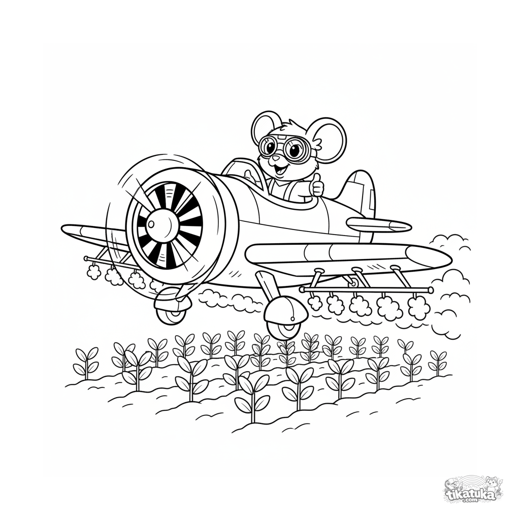 Ausmalbild eines niedlichen Sprühflugzeugs, das tief über einem Maisfeld fliegt. Ein Mauspilot mit Brille. Für Kinder von 4 bis 6 Jahren. Einfacher Chibi-Stil.
