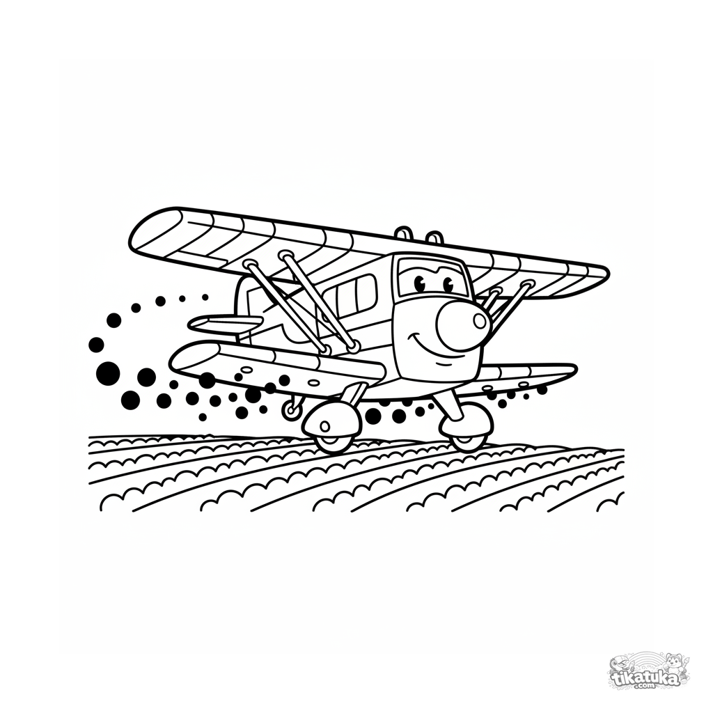 Einfaches Ausmalbild eines Cartoon-Sprühflugzeugs, das über Ackerland fliegt. Große Formen und klare Umrisse, perfekt für die jüngsten Künstler von 2-3 Jahren.