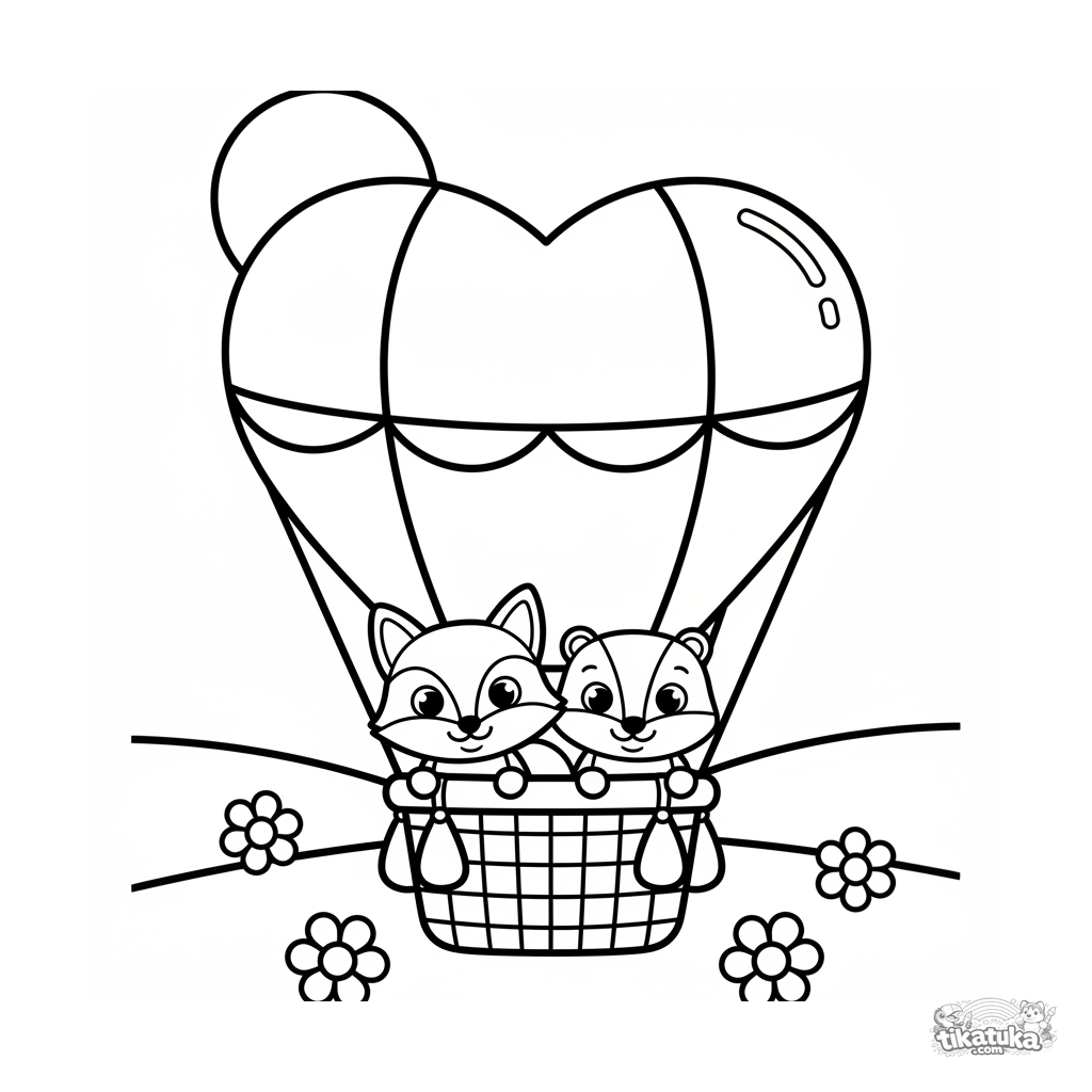 Ein einfaches Ausmalbild für Kleinkinder: Ein herzförmiger Heißluftballon schwebt über einer blumenreichen Wiese bei Sonnenuntergang. Ein lächelnder Fuchs und Dachs sind im Korb. Große Formen, dicke Umrisse.