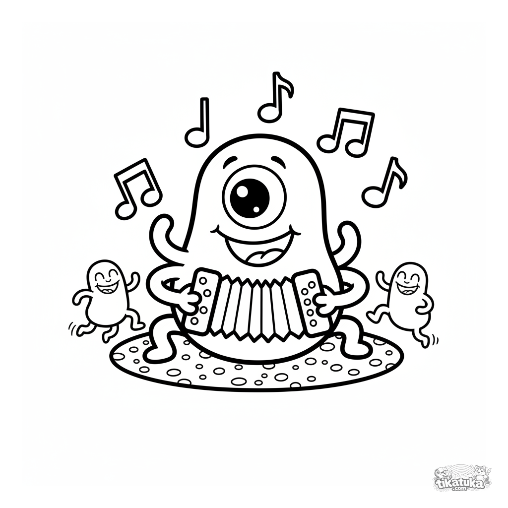 Einfaches Ausmalbild für Kleinkinder einer freundlichen Mikrobe, die Akkordeon spielt. Für 2-3 Jahre. Große Formen, wenig Details, breite weiße Ränder.