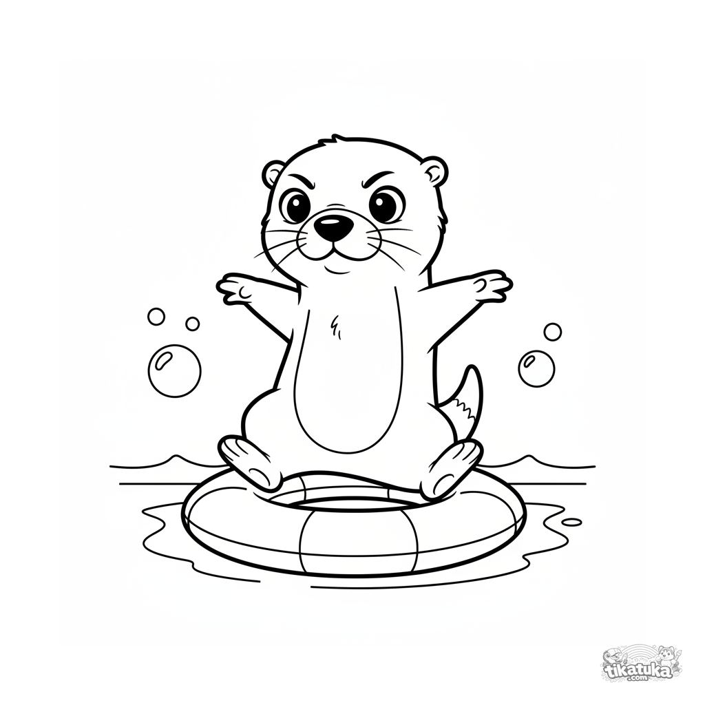 Ausmalbild für Kinder 7-9: Ein verspielter Otter im Comic-Stil versucht, das Gleichgewicht auf einem aufgeblasenen Poolring zu halten.