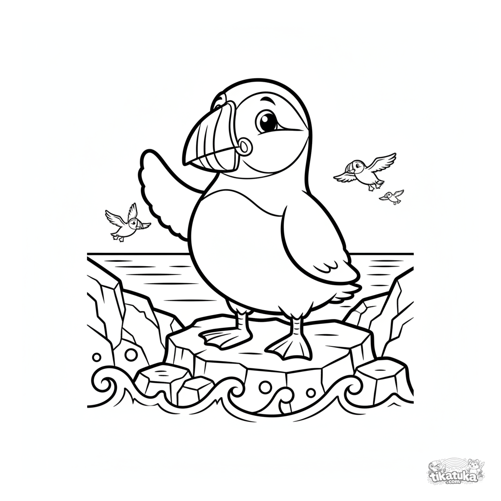 Ausmalbild eines niedlichen, cartoon Papageitauchers auf einer Meerklippe. Für Kinder von 4 bis 6 Jahren.