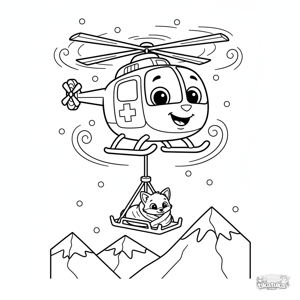 Ausmalbild eines Rettungshubschraubers über einem schneebedeckten Berg. Für 4-6 Jahre. Der Hubschrauber lässt ein Seil hinab, um ein Fuchsjunges zu retten.