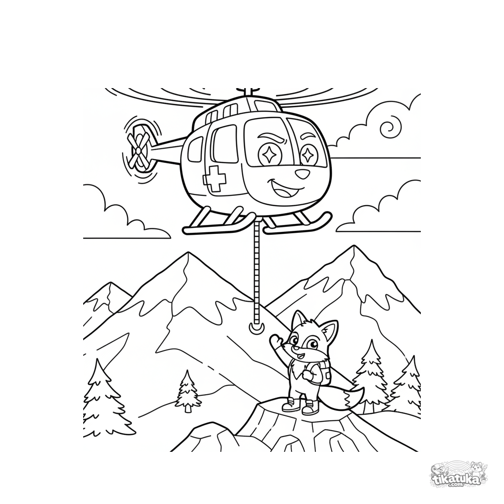 Ausmalbild für 7-9 Jahre: Ein Rettungshubschrauber schwebt über einem schneebedeckten Berg. Dynamische Szene mit klaren Umrissen.