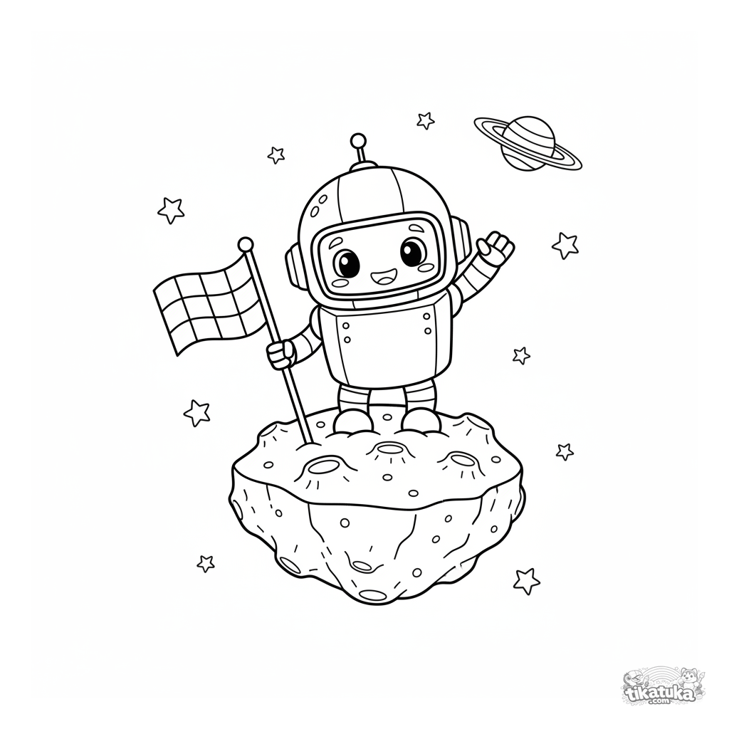Ausmalbild für Kinder 5-7: Ein freundlicher Roboter-Astronaut pflanzt eine Flagge auf einem Asteroiden im Weltraum.