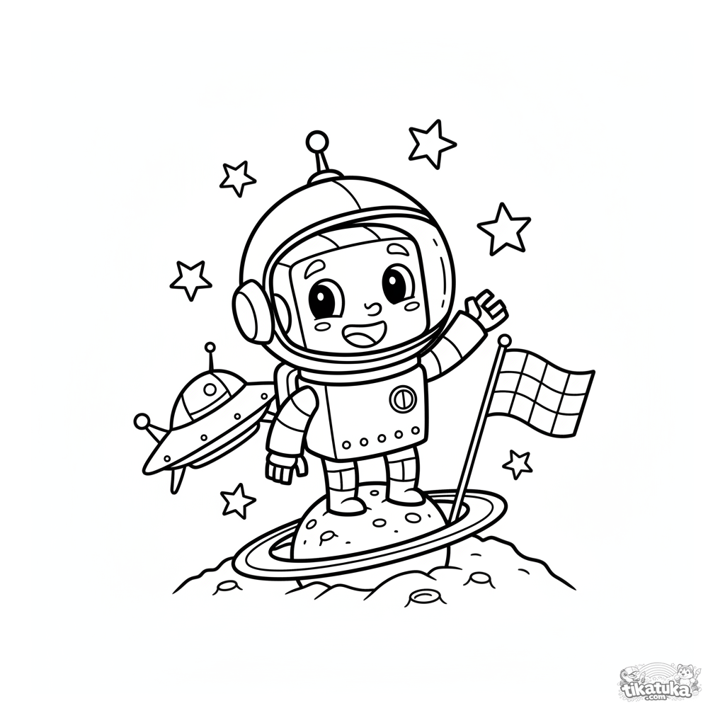 Ausmalbild eines freundlichen Roboter-Astronauten, der eine Flagge auf einem Ringplanet pflanzt. Für Kleinkinder von 2 bis 5 Jahren.