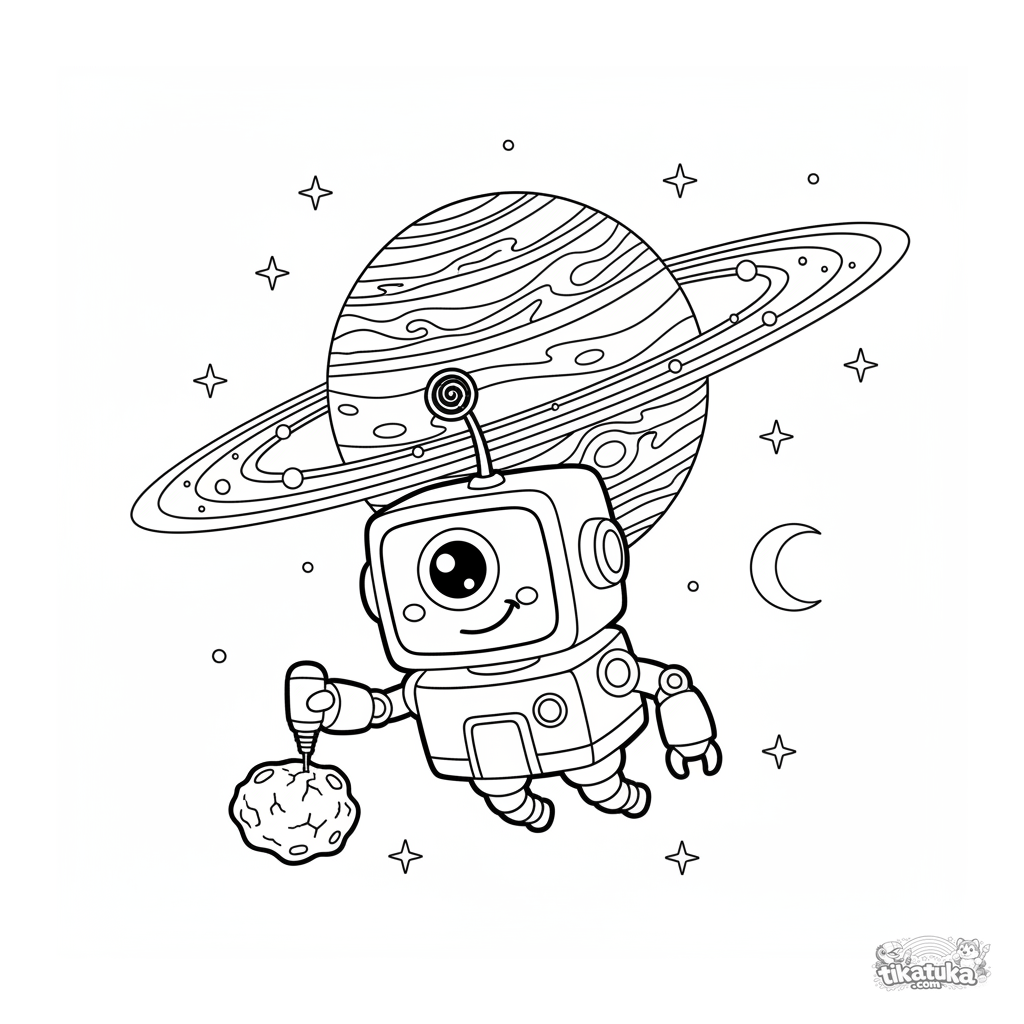 Ausmalbild einer freundlichen Roboter-Sonde, die einen Ringplaneten im Weltraum erforscht. Für Kinder von 8 bis 12 Jahren.