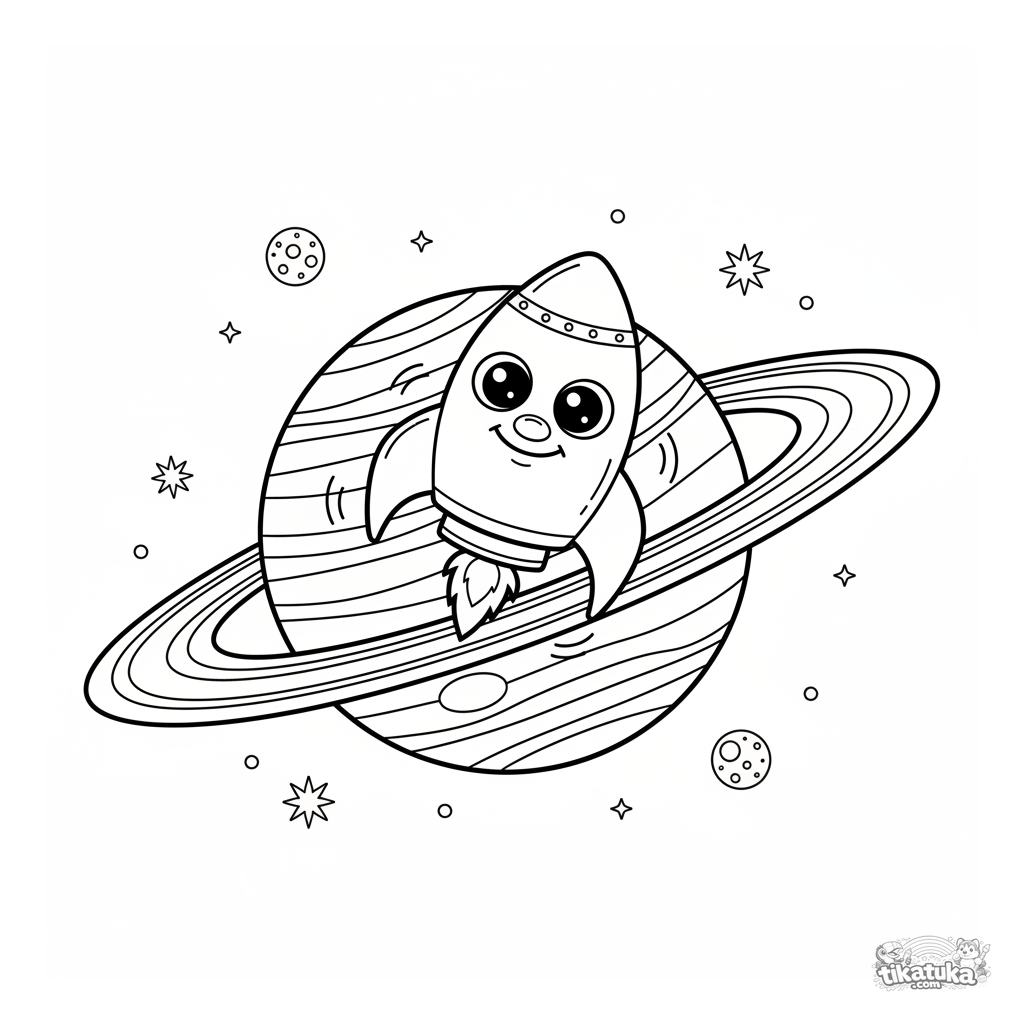 Weltraum-Ausmalbild für Kinder von 4-6 Jahren: eine freundliche Rakete umkreist einen großen Ringplaneten. Einfache Formen.