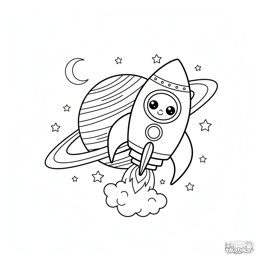 Ausmalbild einer Cartoon-Rakete, die einen Ringplaneten umkreist. Für Kinder von 5-8 Jahren. Weltraumszene mit Bullaugen, Sternen und einer Mondsichel.