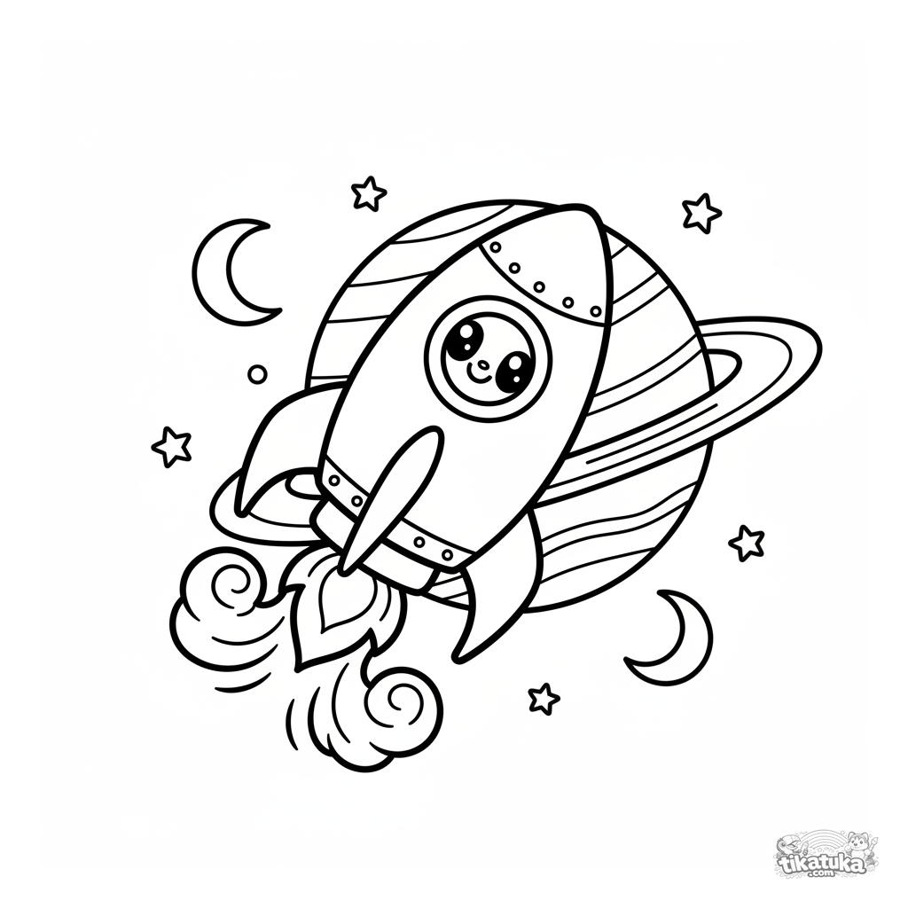 Einfaches Weltraum-Ausmalbild für Kleinkinder 2-5: Eine fröhliche Rakete mit Smiley-Gesicht fliegt um einen großen Ringplaneten vor einem weiten weißen Hintergrund mit einfachen Sternen.
