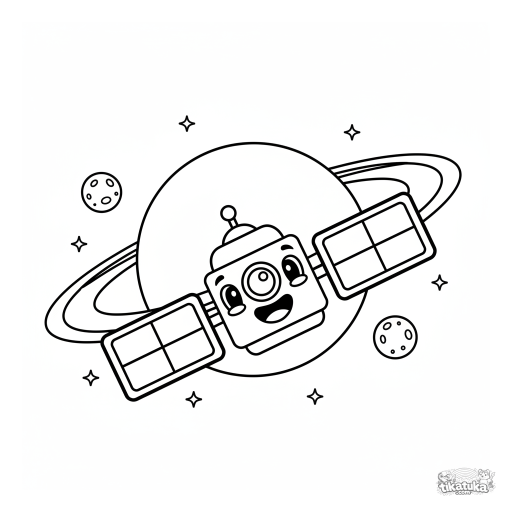 Ausmalbild für Kleinkinder 2-3: Ein freundlicher Cartoon-Satellit mit Solarpanelen umkreist einen riesigen Ringplaneten im Weltraum. Sehr einfache, große Formen.