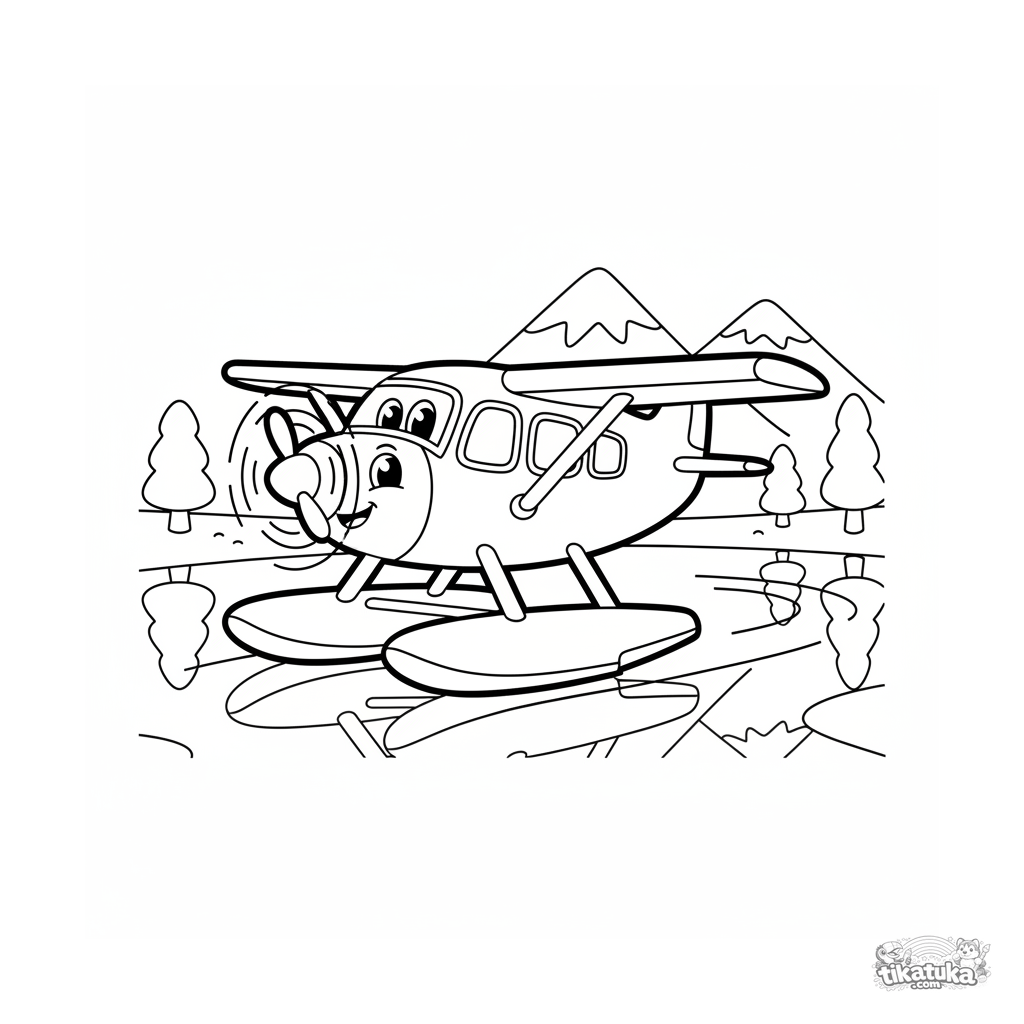 Einfaches Ausmalbild eines Cartoon-Wasserflugzeugs auf einem Bergsee für Kleinkinder von 2-3 Jahren. Große Formen, dicke Umrisse, minimale Details.