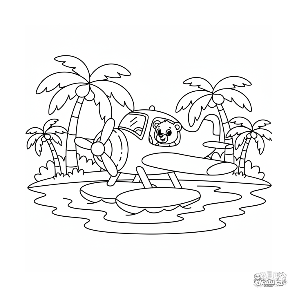 Einfaches Ausmalbild für Kleinkinder von 2-3 Jahren: ein fröhliches Wasserflugzeug auf einem See. Große Formen, klare Umrisse.