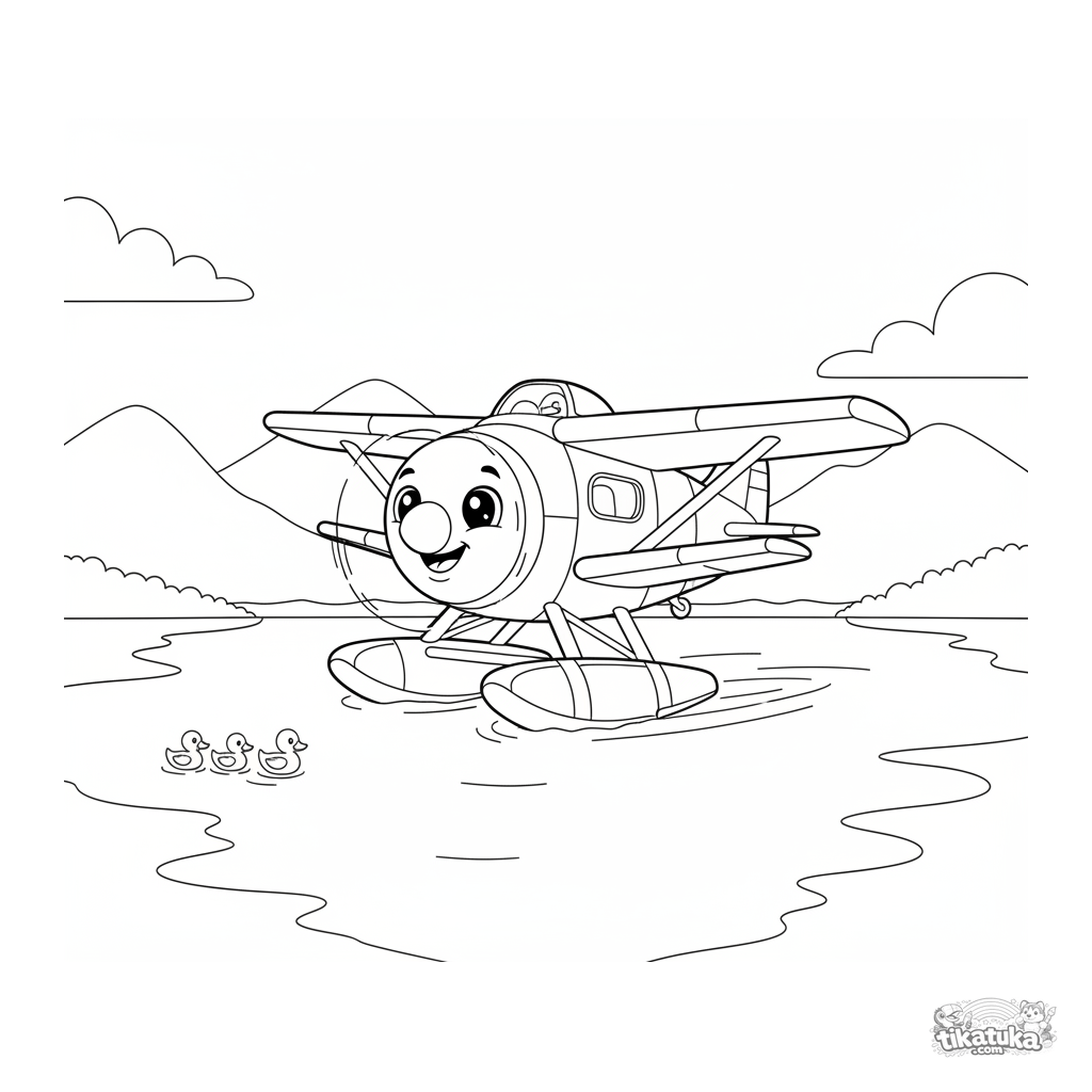 Einfaches Ausmalbild eines süßen Wasserflugzeugs auf einem See für Kleinkinder von 2-3 Jahren. Große Formen, kleine Enten und weiße Ränder.