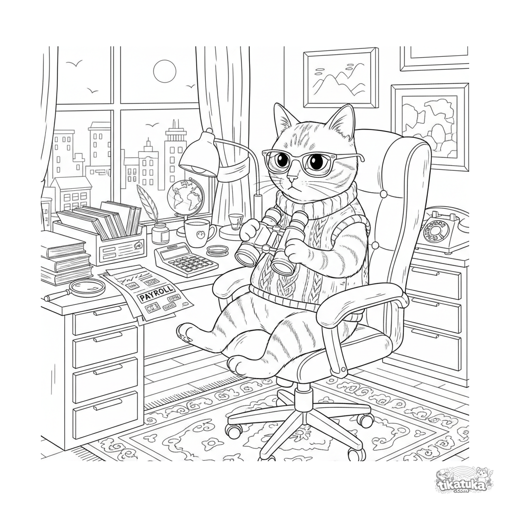 Ausmalbild für Kinder 10-12: Ein Katzen-Buchhalter am Schreibtisch sucht mit einem Fernglas den Gehaltstag. Realistische, detaillierte Szene mit Büro-Accessoires.