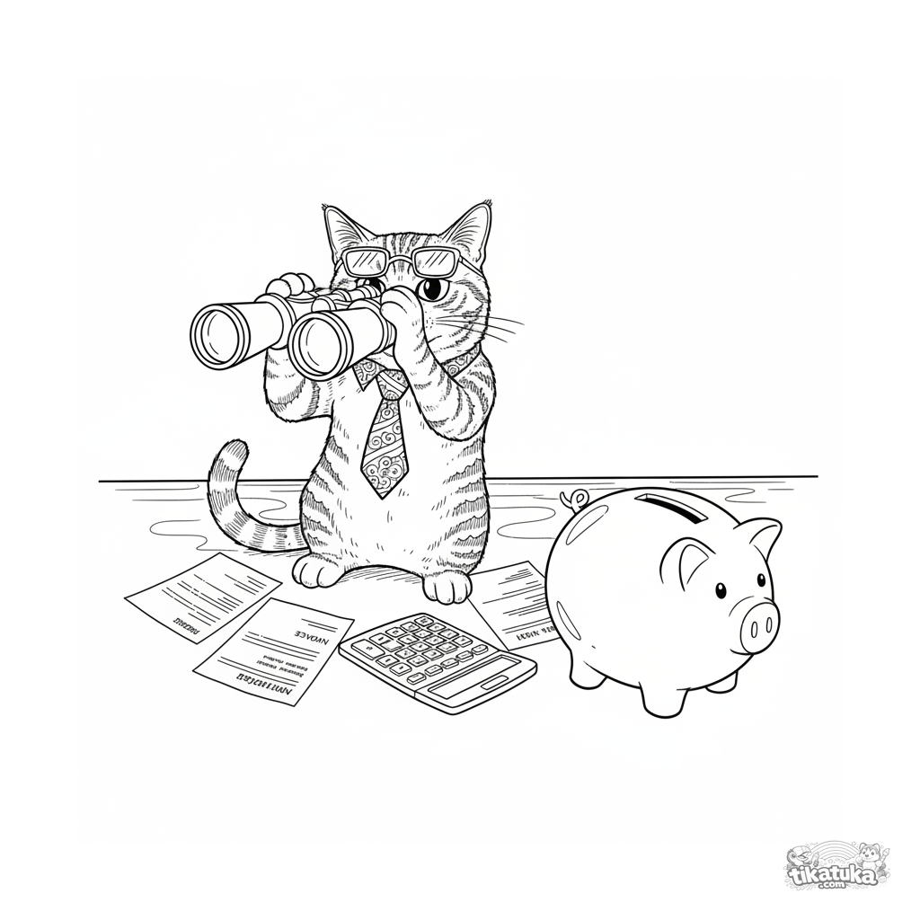 Ausmalbild für Kinder 10-12: Ein Katzenbuchhalter mit Krawatte späht mit einem Fernglas auf ein Sparschwein in seinem Heimbüro. Detaillierte lustige Warteszene auf Gehalt.