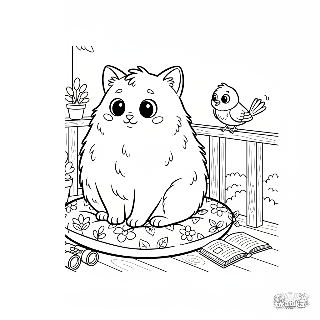 Ausmalbild für Kinder 4-6: Eine flauschige Katze sitzt auf einem Kissen auf der Veranda und beobachtet neugierig einen kleinen Vogel am Geländer. Süße, lustige Szene mit Fernglas.
