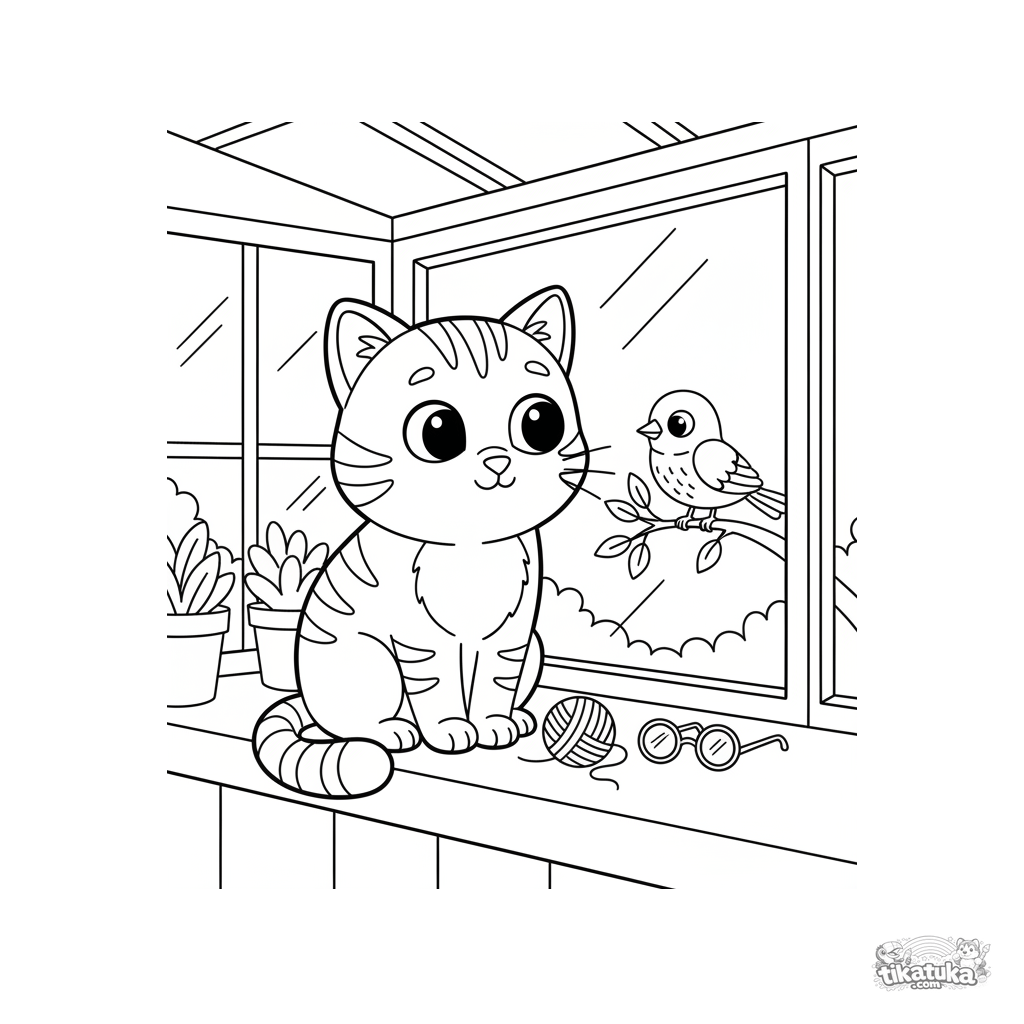 Ausmalbild für Kinder 7-9 Jahre: Eine neugierige Katze sitzt auf einem Verandafensterbrett und beobachtet einen Vogel draußen. Gemütliche, ruhige Szene.