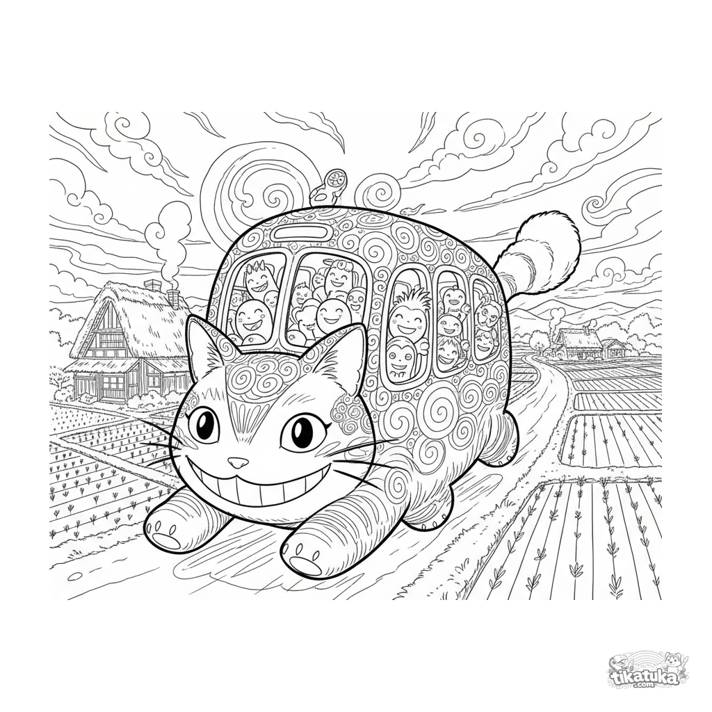 Aquarell-Anime-Ausmalbild: Ein fröhlicher Katzenbus rast auf einer Landstraße im Sonnenuntergang. Detaillierte Szene mit Reisfeldern und Geist-Passagieren für 10-12-Jährige.
