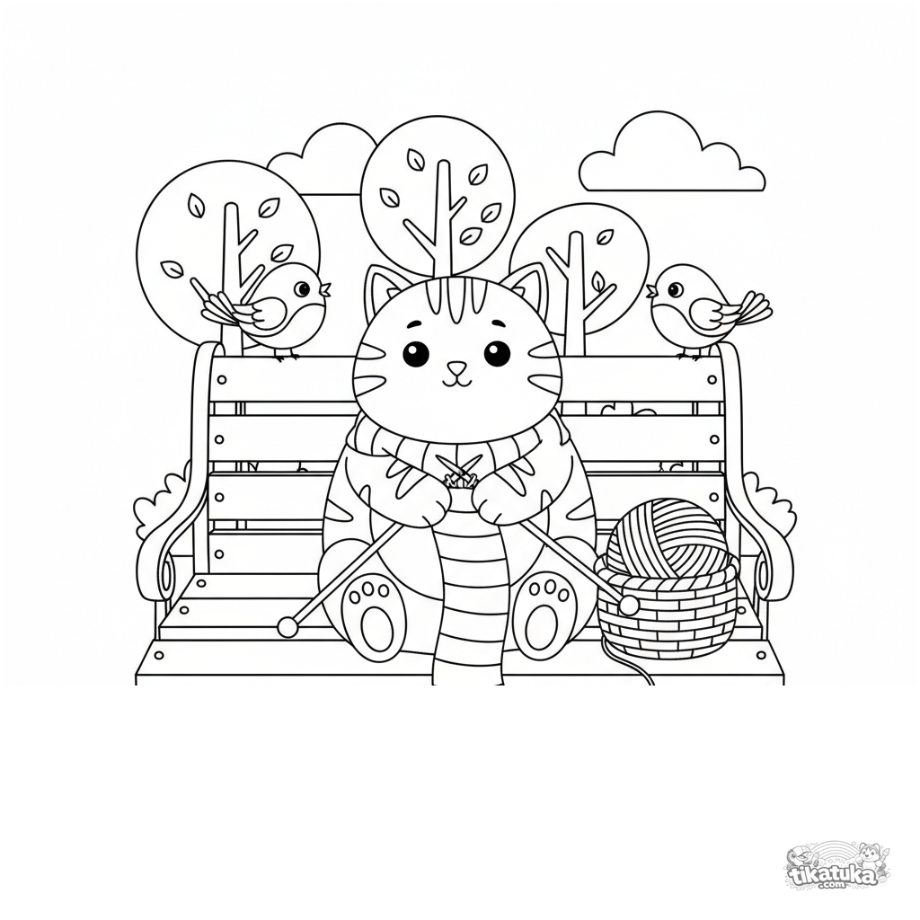 Ausmalbild für Kinder 4-6: Eine gemütliche Katze strickt einen langen Schal auf einer Bank, mit Wollkorb. Ruhige, süße Szene.
