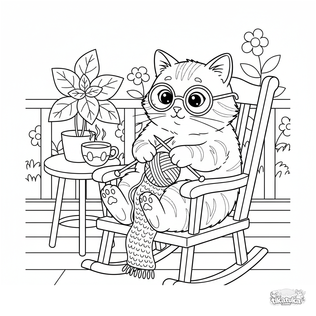 Ausmalbild für Kinder 4-6: Eine gemütliche Katze strickt einen Schal in einem Schaukelstuhl auf der Sommerveranda. Ausgewogene Details.
