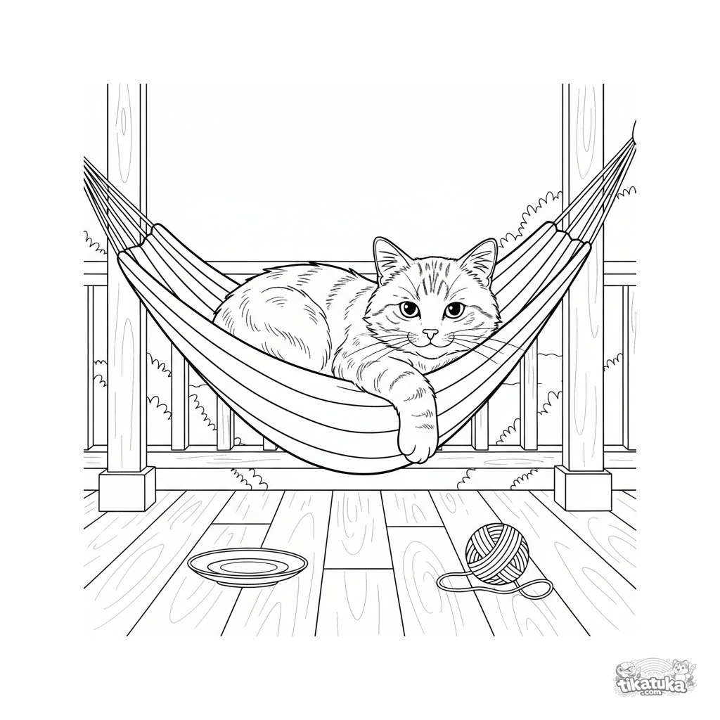Ausmalbild für 7-9 Jahre: Eine flauschige Katze döst in einer Hängematte auf einer Datscha-Veranda. Mäßiges Detail, gemütliche Szene.