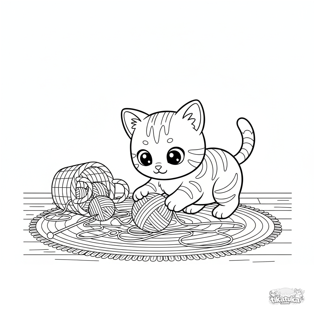 Ausmalbild für Kinder 4-6: Ein verspieltes Kätzchen spielt mit einem verhedderten Wollknäuel auf einem Verandateppich. Mittlere Details.