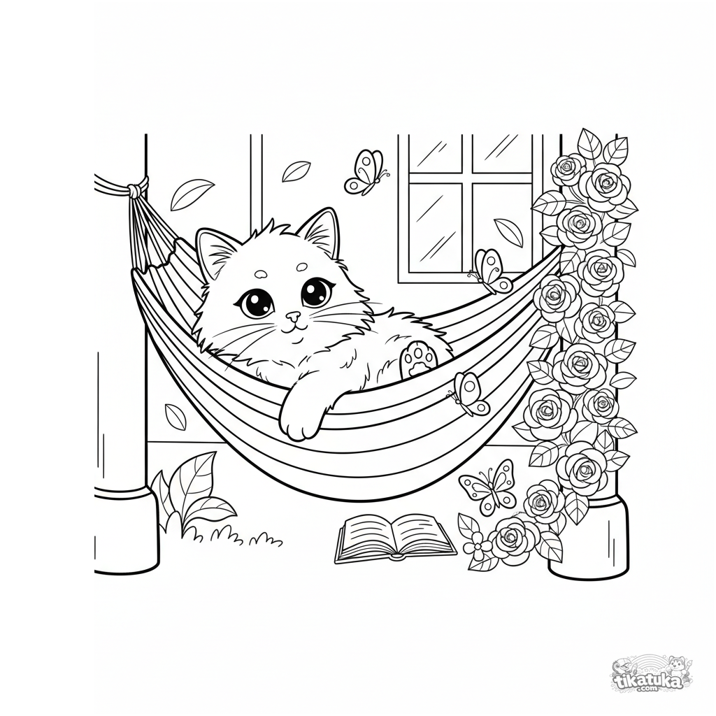 Ausmalbild für Kinder 4-6: Eine flauschige Katze entspannt in einer Hängematte und beobachtet Schmetterlinge. Niedliche und ruhige Szene mit einfachen Details.