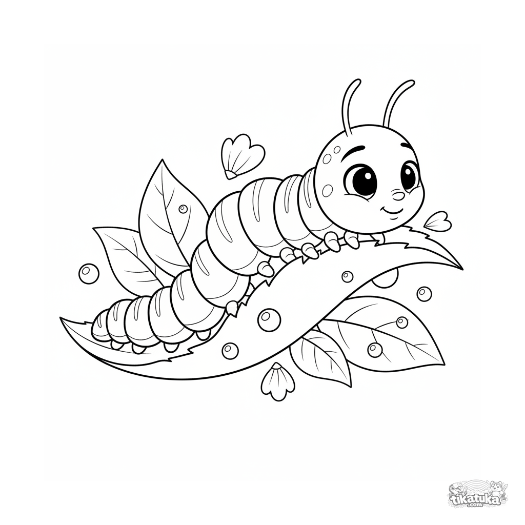 Ausmalbild für Kinder: Eine gestreifte Raupe krabbelt emsig am Rand eines großen, betauten Blattes entlang. Klare Umrisse und ausgewogene Details.