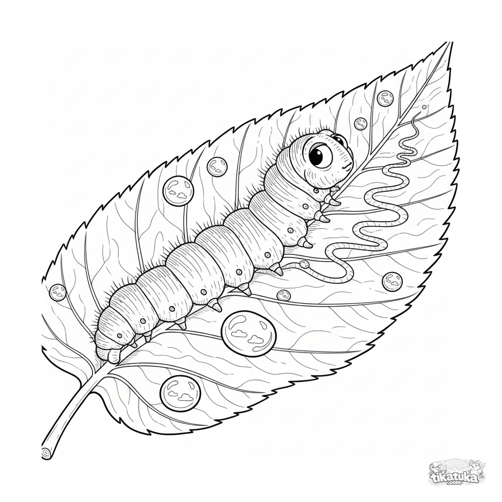Detailliertes Ausmalbild für 10-12 Jahre: Eine pelzige Raupe untersucht Tauspuren auf einem großen Blatt. Realistische Insektenillustration.