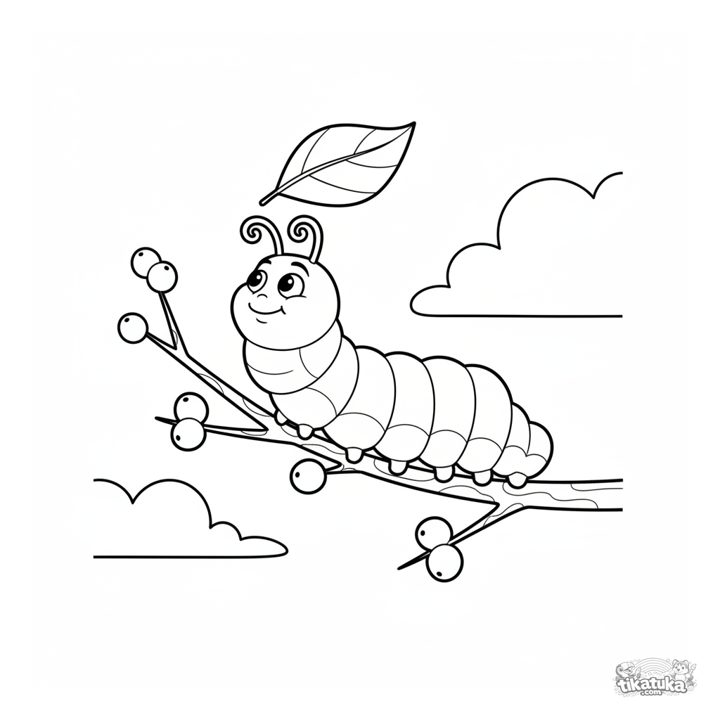 Ausmalbild für Kinder 4-6: eine pummelige Raupe, die auf einem beerengeschmückten Ast kriecht. Mäßiges Detail, realistischer Stil, fördert Feinmotorik.