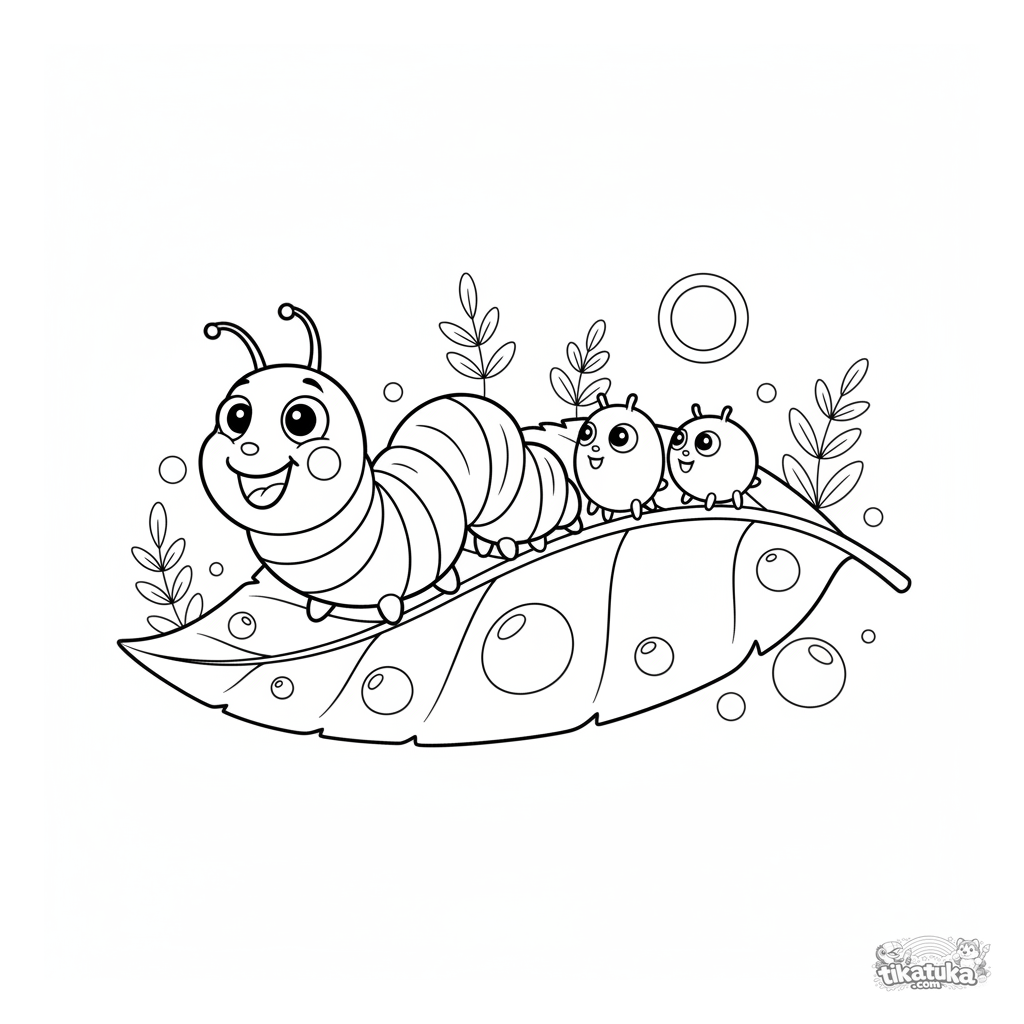 Ausmalbild für Kinder 4-6: Eine fröhliche gestreifte Raupe führt einen Freundeparade über ein großes Blatt mit Tautropfen. Mäßiges Detail.