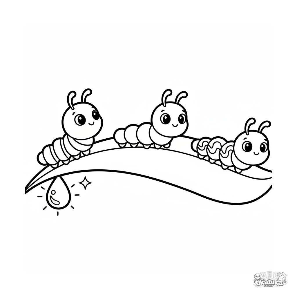 Ausmalbild für Kleinkinder 2-3: drei fröhliche Raupen paradieren über ein Blatt als Brücke über einem Tautropfen. Sehr einfache Formen.
