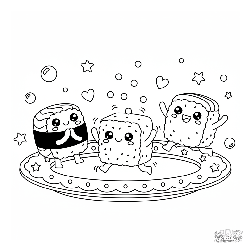 Ausmalbild von feiernden Sushi-Rolls auf einem Teller. Drei niedliche Rolls. Für Kinder von 4-6 Jahren.