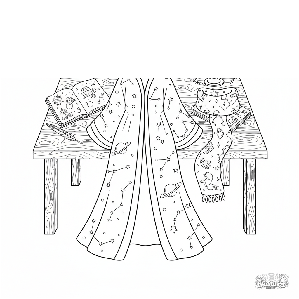 Detailliertes Ausmalbild für 10-12 Jahre: Ein magisches, mit Sternbildern besticktes Gewand auf einem Observatoriumstisch zwischen Büchern und Instrumenten.