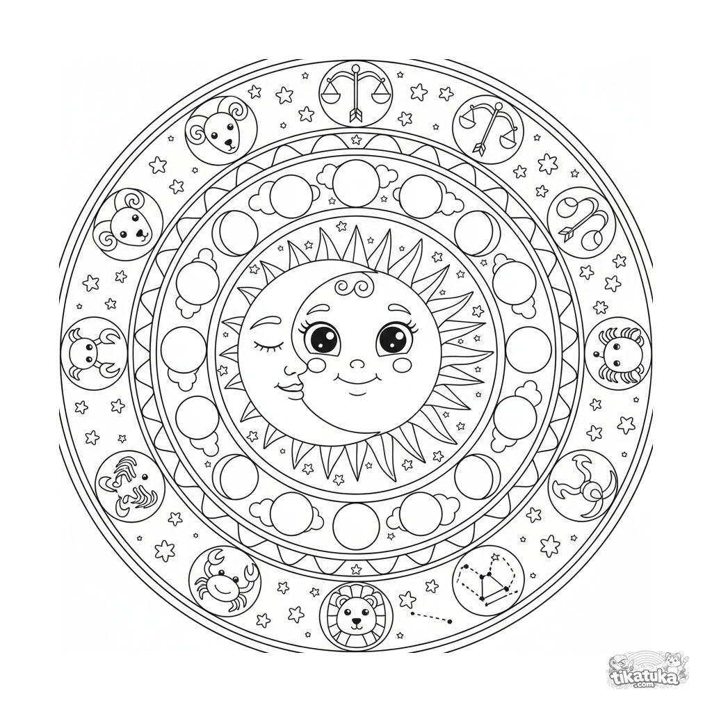 Himmlische Sonne-und-Mond-Mandala Ausmalbild für Kinder von 10-12 Jahren. Enthält Mondphasen, Sterne und Tierkreissymbole. Komplexes symmetrisches Design mit hohem Detaillierungsgrad.