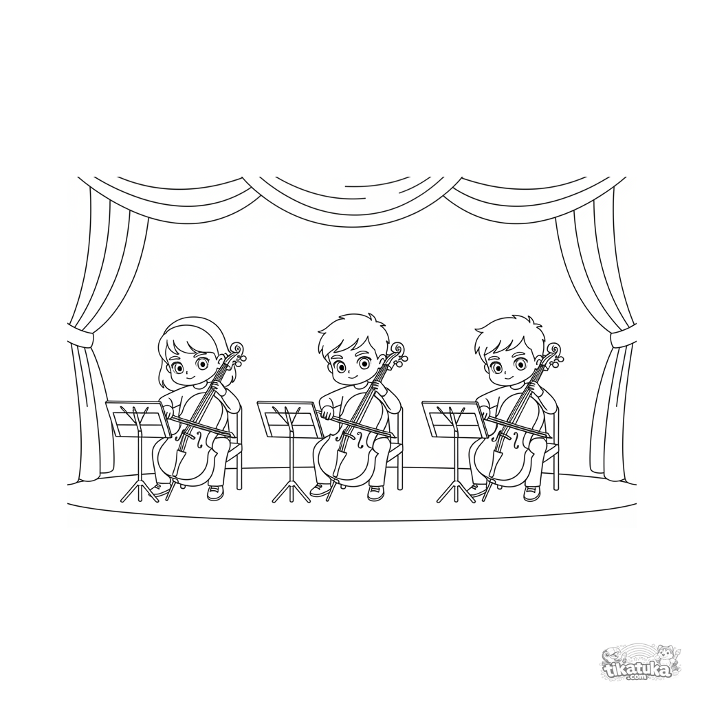 Ausmalbild für 7-9 Jahre: Ein Trio junger Cellisten spielt auf der Bühne eines Konzertsaals. Die Kinder spielen konzentriert vor dem Hintergrund eines großen Vorhangs.