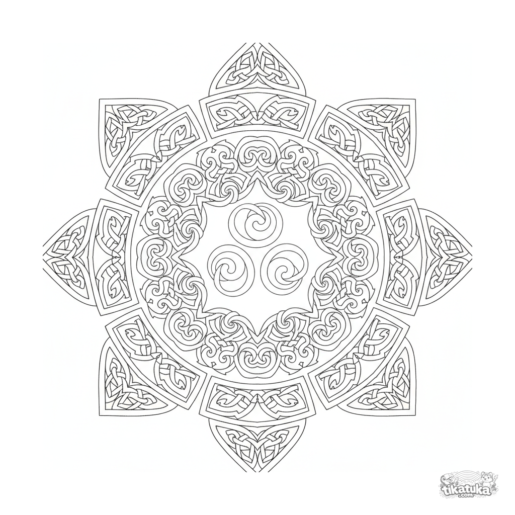 Detailliertes keltisches Knoten-Mandala-Ausmalbild für 10-12 Jahre. Zentrales Dreieinigkeitssymbol, Ring verschlungener Spiralen, äußere Schildknoten, komplexes vierfach symmetrisches Geflecht.